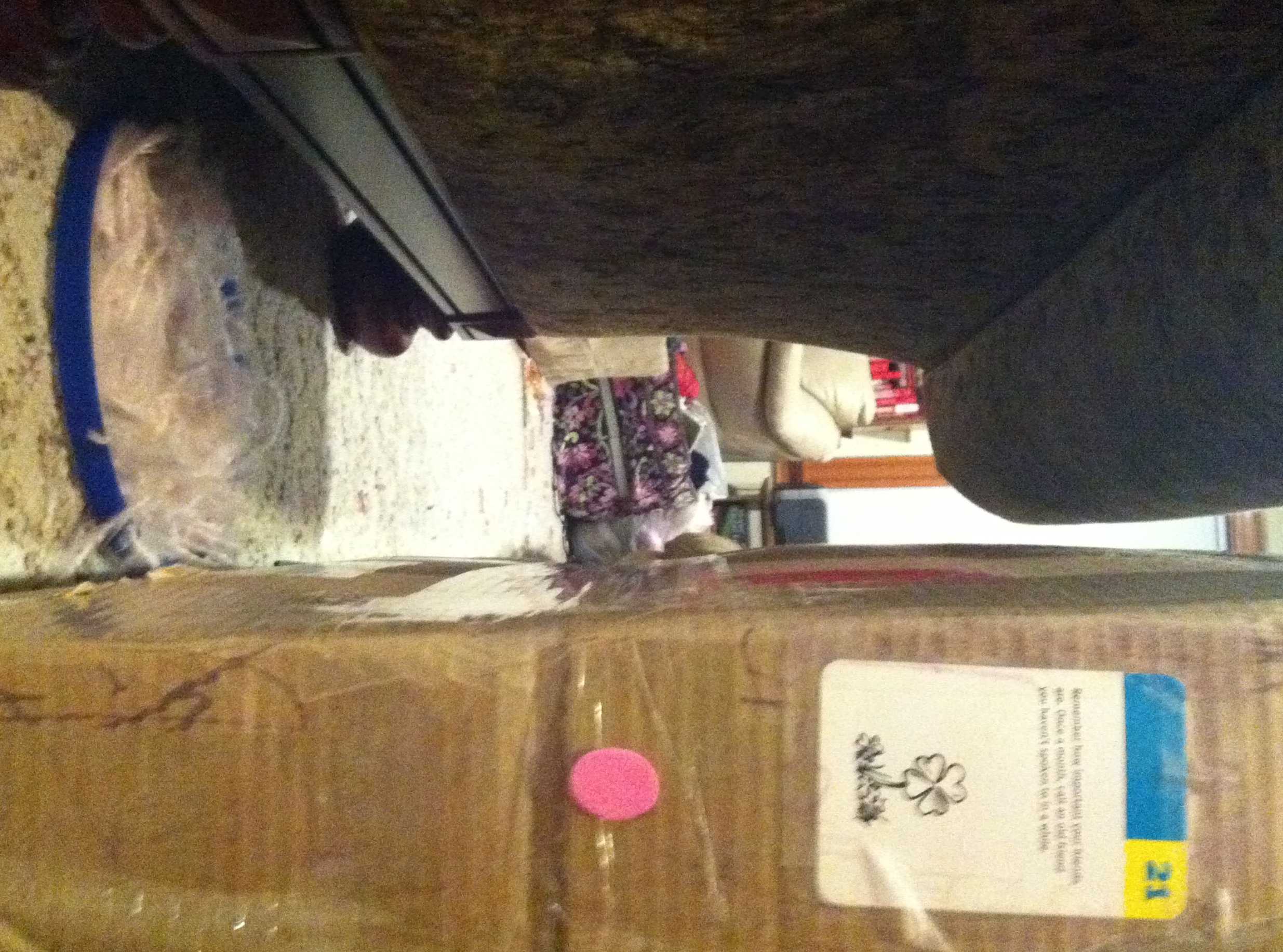 (The big box is the box containing the new storage ottoman that we ordered from Ikea to replace our old one, which is slowly collapsing under the weight of all the unfinished knitting stored inside it. The box, which we immediately pressed into service as an end table for our couch and a communications board for any dinosaurs in residence in the house, has been waiting patiently for months to us to open it and assemble the ottoman inside. Building the ottoman had been on my Honey-do list for Columbus Day weekend, but now that I know the box is a hunter’s lair, it looks like we’ll be going to the Topsfield Fair instead.)