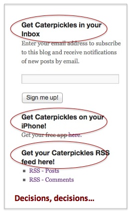 Email, RSS, Google Reader or WordPress dashboard (for fellow WordPress users)–it’s all good. Most bloggers feature options for following their blogs pretty prominently on their sites. For example, you can find several options for following Caterpickles near the top of the right hand column on every page. It’s a sign of how much we care.
