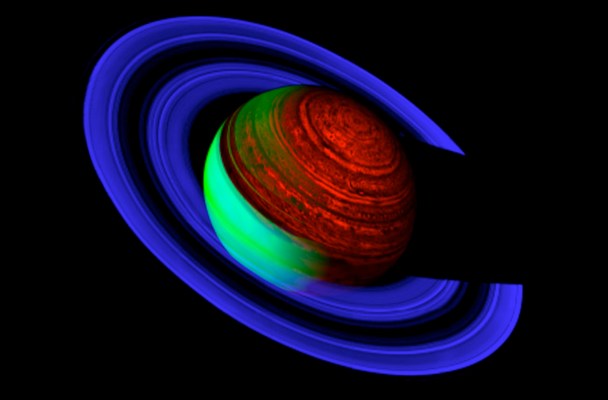 Neon Saturn: A false color mosaic of 25 images of Saturn taken by the Cassini spacecraft over a period of 13 hours. (Image Credit: NASA)