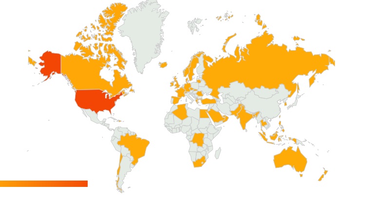 My little blog has a global audience. Red is where most of you are — no surprises there, but I was surprised to see I had so many readers around the world. Thank you! And welcome!