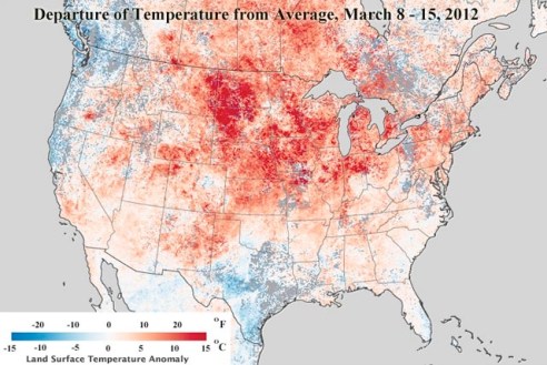 Take a look at this land surface temperature map from NASA (which I found via Weather Underground). The map compares average ground temperatures from March 8-15, 2012 against the average ground temperatures from last year. Places that are warmer are shown in red, cooler in blue. Looks like Massachusetts isn’t the only place with unseasonably warm weather.