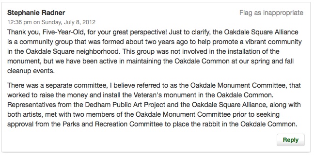 As you may know, Caterpickles has been picked up by the Norwood Patch, which means The Five-Year-Old’s Through the Lens series is being cross-posted over there as well. Stephanie Radnor responded to the post on the Patch about the Oakdale rabbit to clarify the groups involved in the maintenance of the Oakdale Square Common and the bunny’s installation. In a nutshell, there are two groups associated with the Oakdale Square Common — the Oakdale Monument Committee, which raised the funds for and oversaw the initial installation of the Veterans’ Memorial, and the Oakdale Square Alliance, which is responsible for promoting a vibrant community in the Oakdale Square neighborhood. Both Oakdale committees were involved in decision to place the bunny on the common. Ms. Radner’s original comment from the Patch is below.