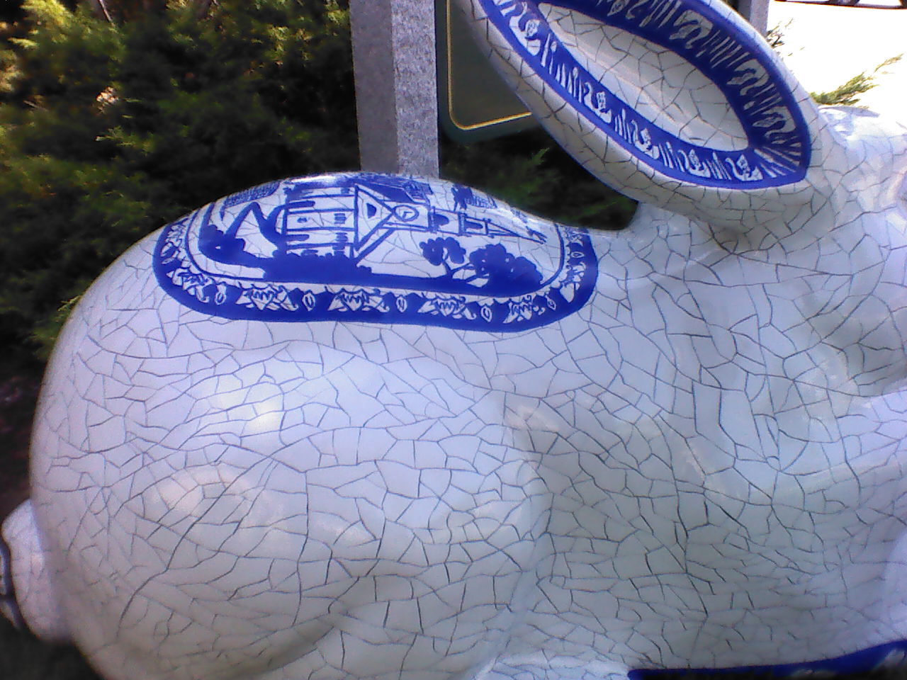 Founded by the Robertson Family in 1896 at the height of America’s Arts and Craft Movement, Dedham Pottery quickly became known around the country for its high-fire stoneware with thick cobalt border designs and controlled fine crackled glaze. Hugh C. Robertson modeled the crackled glaze on his own pottery after the blood-red crackled glaze he saw on several pieces of Chinese pottery on display at the 1876 Centennial Exposition in Philadelphia. The company’s most popular pattern was the iconic crouching bunny which inspired the gigantic fiberglass rabbits that are rapidly taking over Dedham.