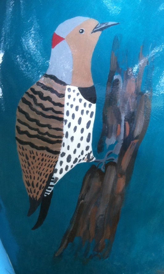 Perhaps unsurprisingly, Angevin feels a personal connection with nearly every bird on her rabbit. The flicker perched on a hollow tree near the tail of her bunny is modeled after a flicker that lives in a hollow tree behind Angevin’s house.