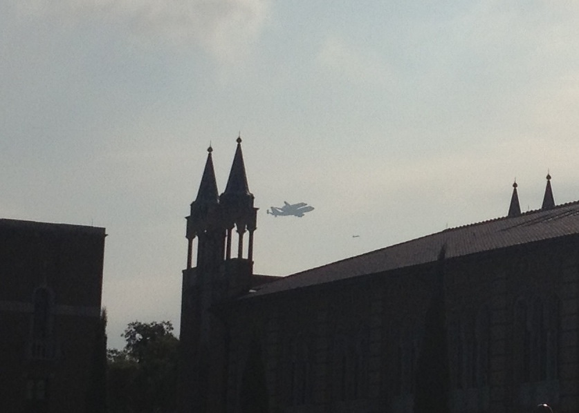 Turns out this was just one of many sightings of the Endeavour on its way to its new permanent home in Los Angeles, CA. In addition to Houston, the space shuttle’s final journey included flyovers in Tucson, Arizona and Austin, Texas.