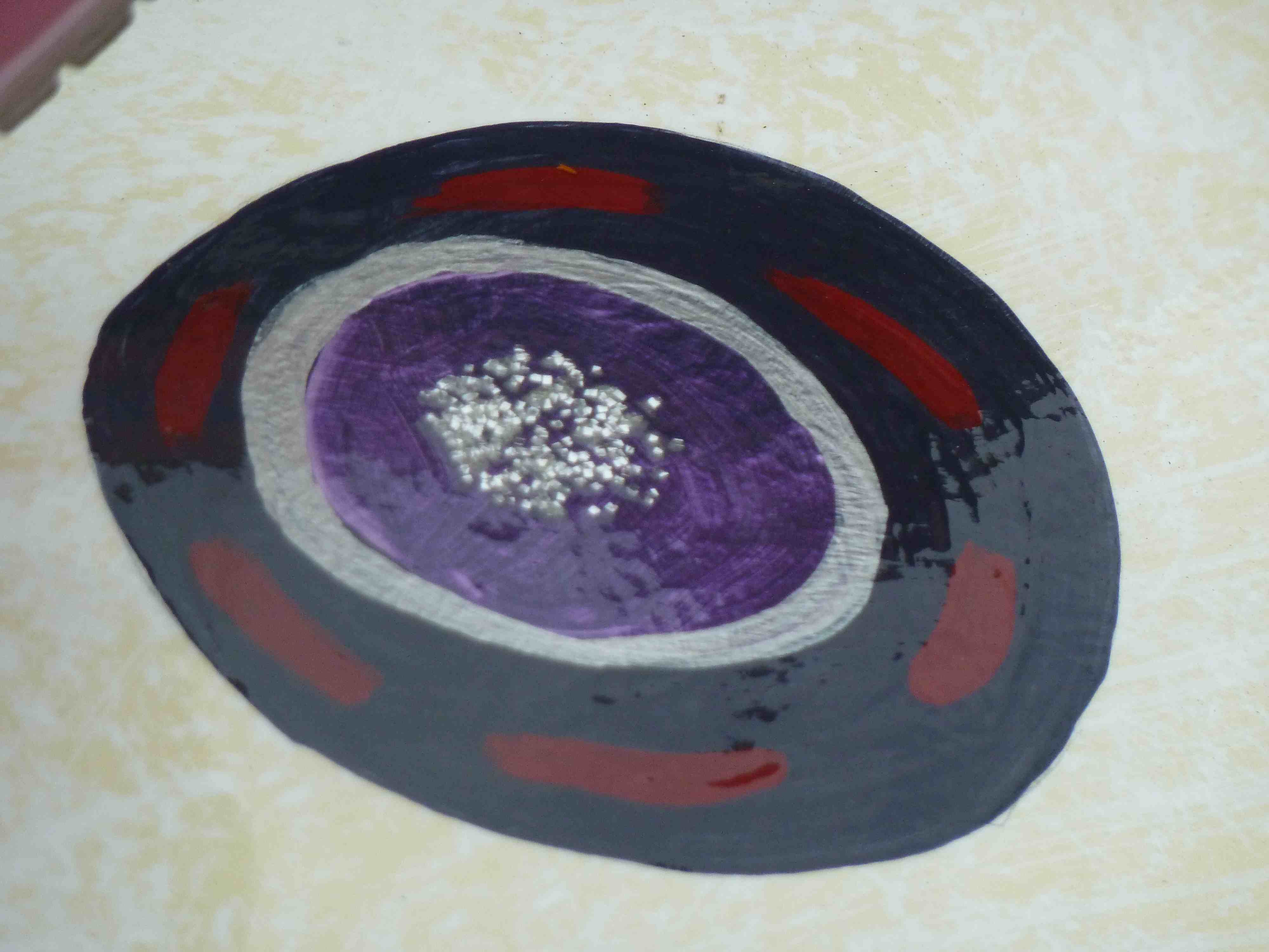 “Glitter,” Cathy replied. “I used a special glue, then added the glitter. Then I added a coat of clear paint–acrylic–over the top.”
