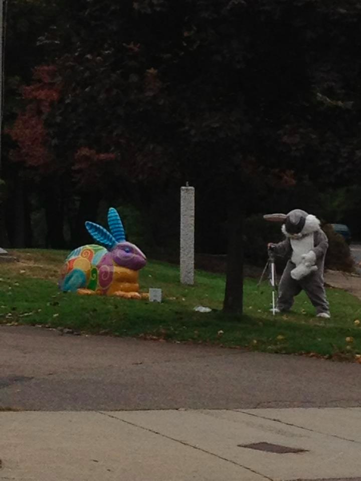 Bunny takes self-portrait with the Spiral Bunny. (Photo: Dedham Public Art Project, Spiral Bunny (c) 2012 Lisa Houck)