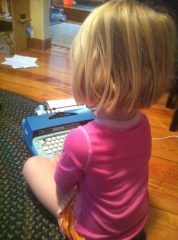 The Five-Year-Old, sitting down to type up some business cards at her new-to-her electric typewriter: “Mommyo, are computers an older type of species than you?”