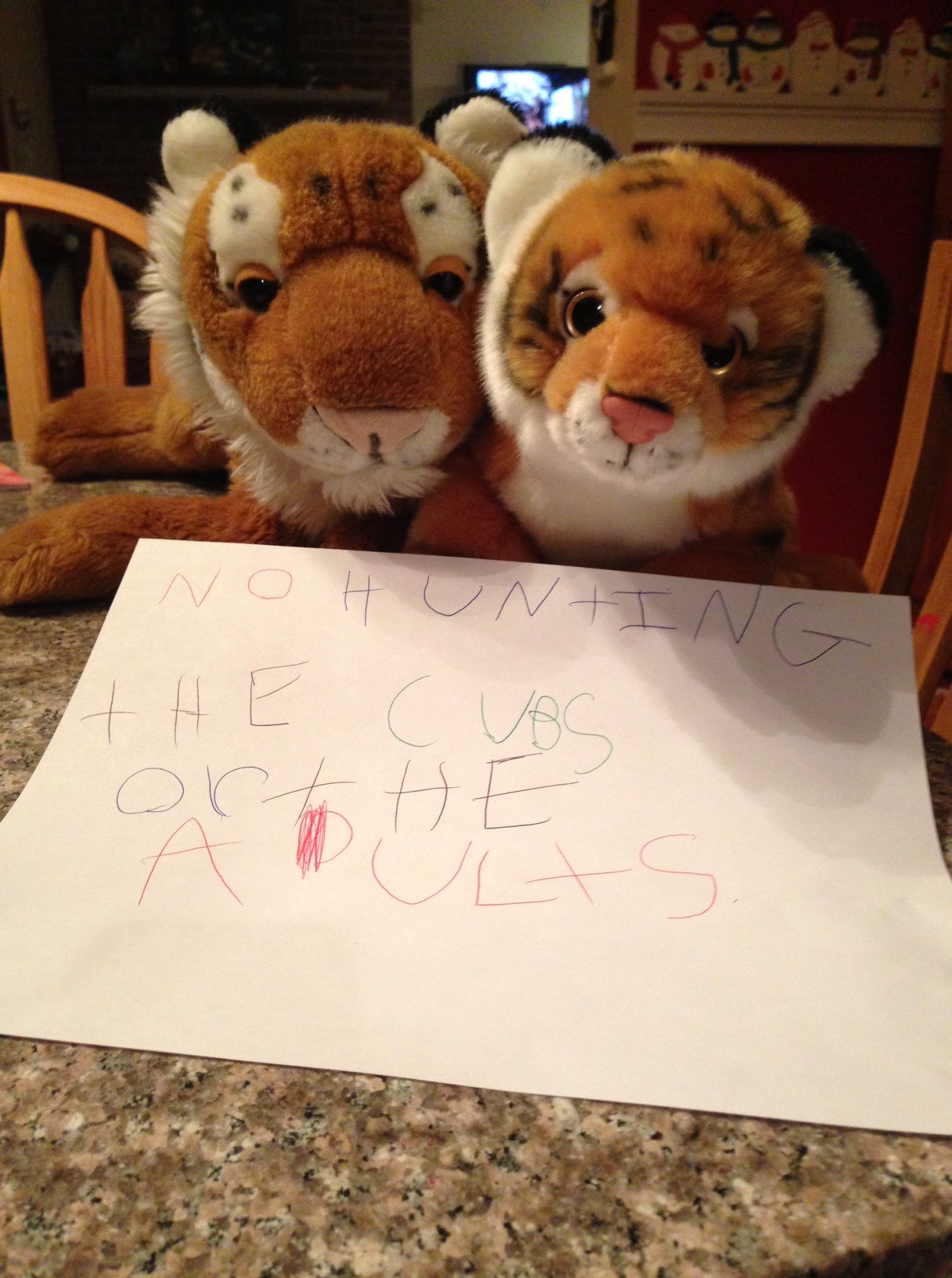 The Five-Year-Old takes a stand: “No killing tigers. Period.”