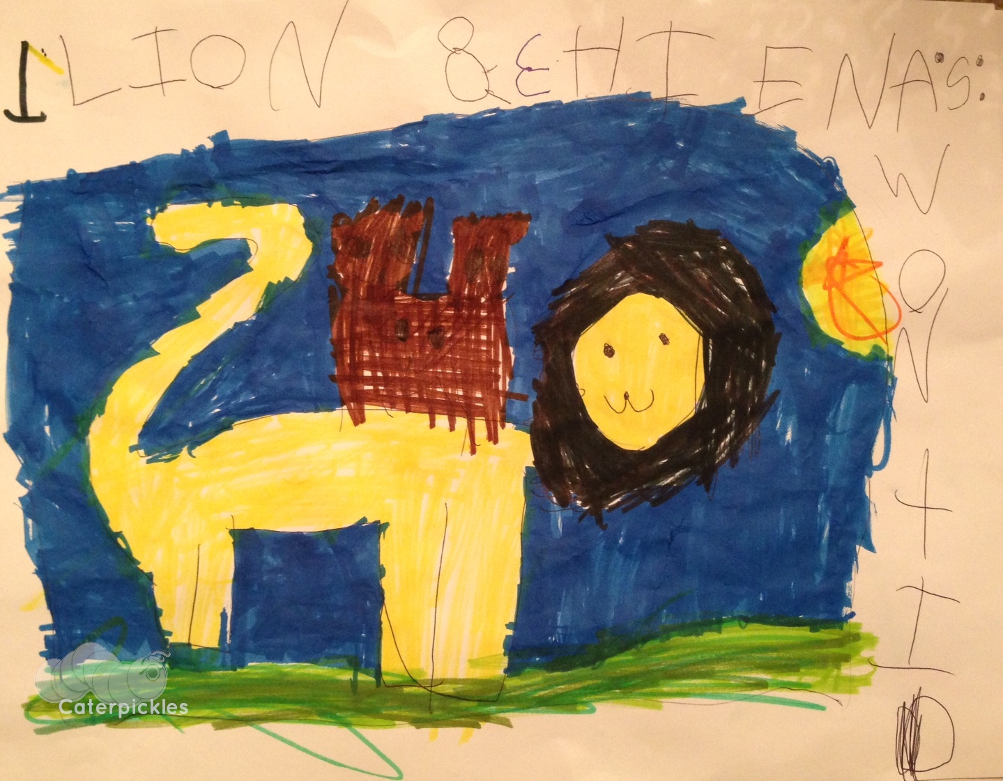 The Wanted Poster. The writing reads “1 Lion 8 ehienas [hyenas]: Wontid [wanted]”. I just adore this phonetic spelling phase. (Picture: The Six-Year-Old)
