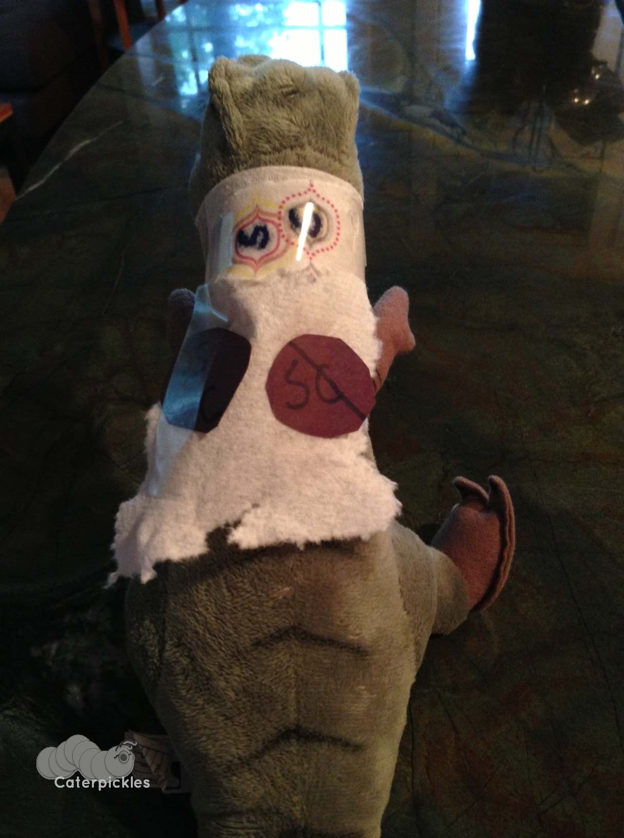 The super fancy S-C at the top of the toilet paper cape stands for “Super Criminal.” The crossed out S/C in the red circle stands for “No Super Cats,” reflecting Grace Elvis the T. Rex’s courageous stand against the Super Cat hegemony in The Six-Year-Old’s Stuffed Animal Domain.