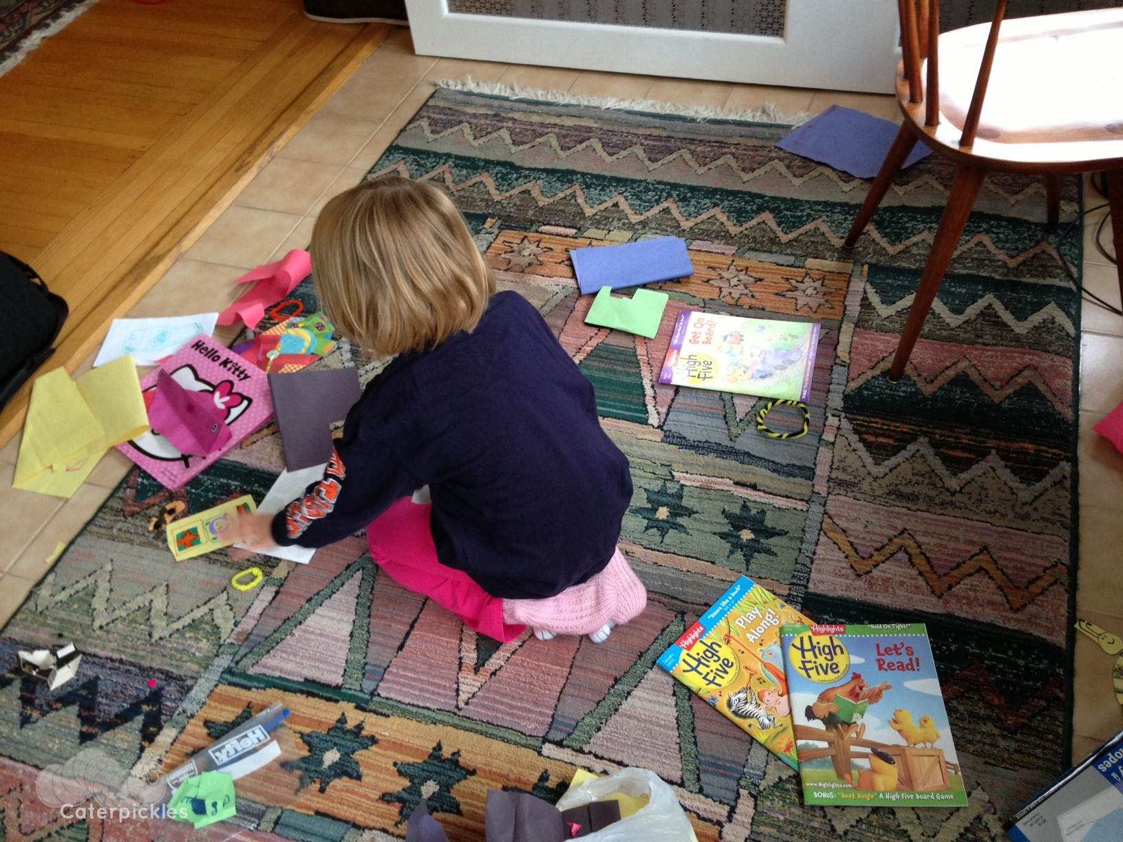 The construction paper may be thick on the ground here at Caterpickles Central, but willing workers aren’t. Oh The Six-Year-Old will clean it–eventually–but the half an hour it takes her to do it will be agonizing for both of us. Since she didn’t used to complain quite so loudly about cleaning up her messes when we lived in Norwood, I’m pretty sure this is her way of releasing the stress she feels about our move. But that doesn’t mean I have to put up with it.