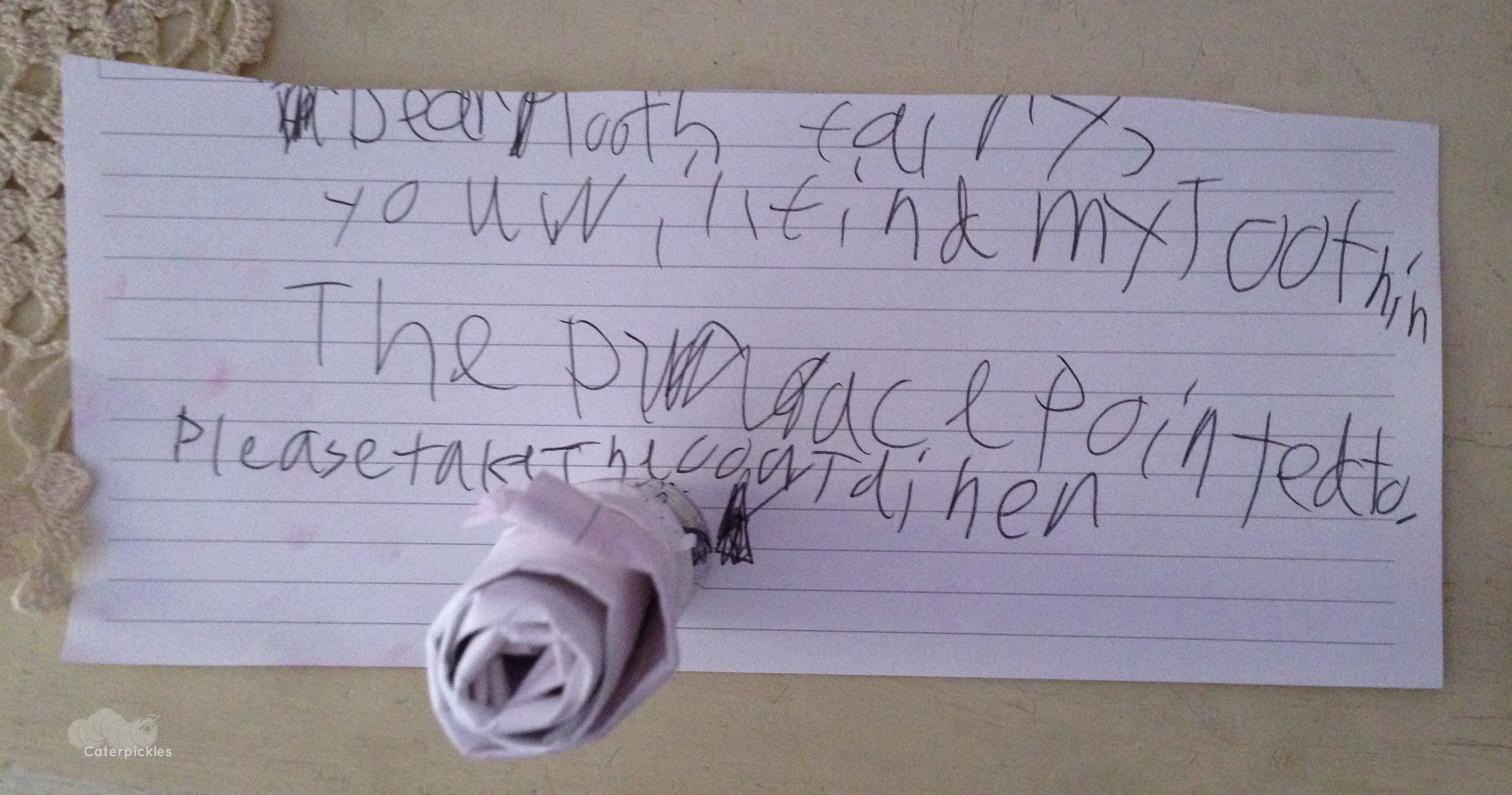 The note reads: “Dear Tooth Fairy, you will find my tooth in the place pointed to. Please take the container.” (Photo: Shala Howell)