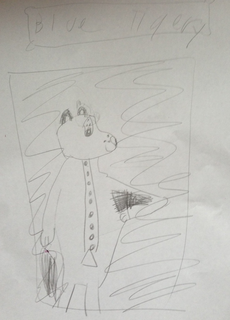Earlier this summer, The Eight-Year-Old stumbled onto the concept of derivative art. She looks up various works of art on her Daddyo’s iPad, then redraws them as portraits of Tigery. Earlier this summer, she integrated Tigery into da Vinci’s Mona Lisa, Munch’s The Scream, and Manet’s Self-Portrait with Palette. This week, The Eight-Year-Old and her buddy Tigery are reworking Thomas Gainsborough’s The Blue Boy.