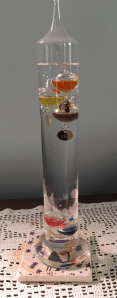 So, as a refresher, to use a Galileo thermometer, you read the label on the lowest bubble in the cluster at the top of the thermometer. If you live in the United States, you then convert that temperature to Fahrenheit.