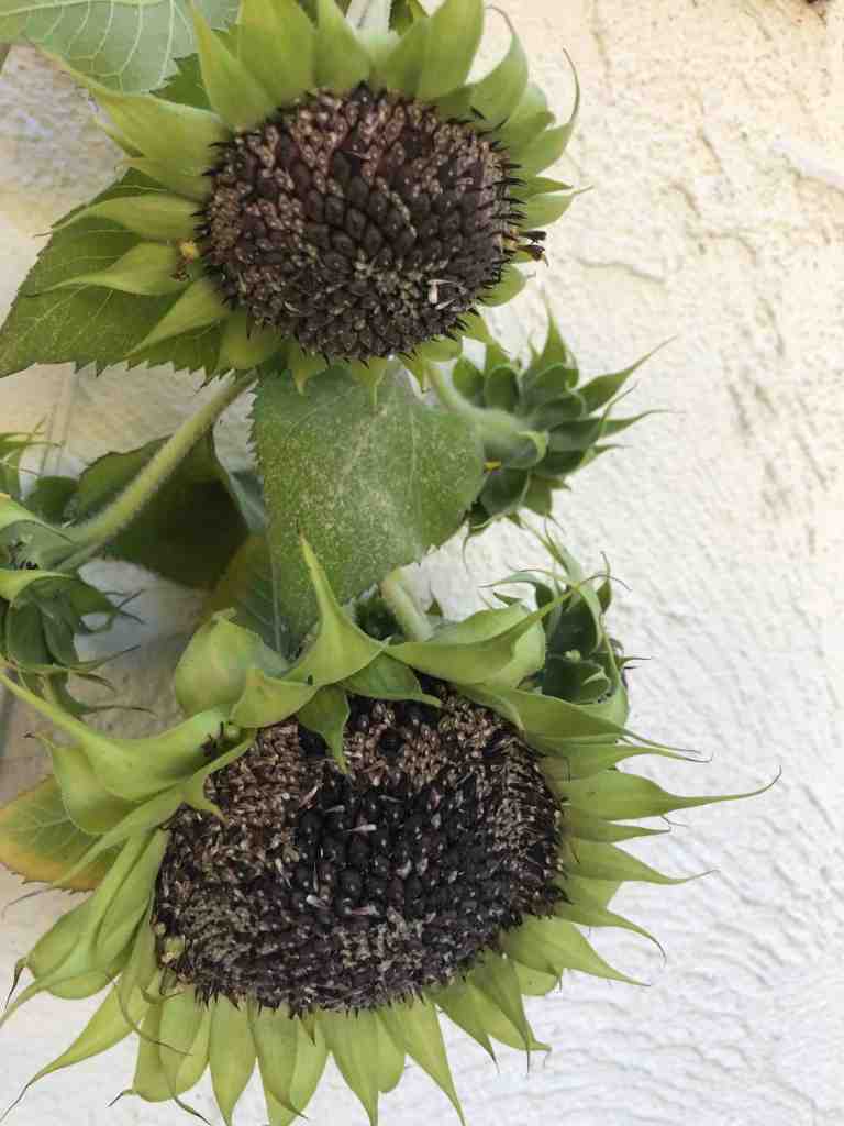 So, I’ve placed my crop of sunflowers in a paper bag, and have hung them upside down to dry out for a few weeks. Sometime in early August, I’ll take them out of the bag and pry the seeds off the flower heads to see what I’ve got. Hopefully there will be enough seeds in good condition to store some to plant next year. The rest I’ll feed to the birds (and squirrels) this winter. That is, if they will eat them.