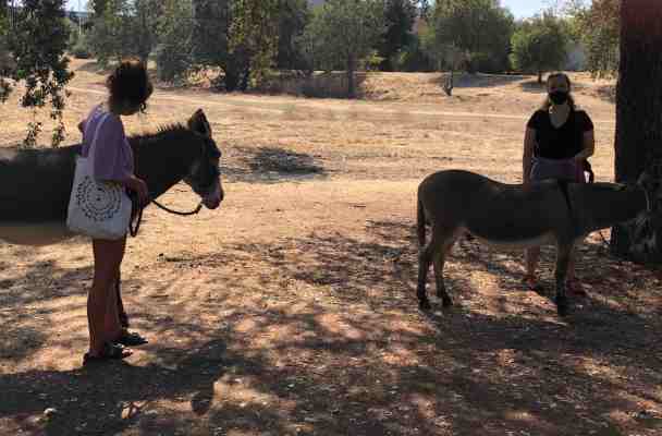 Two women walk donkeys on a leash down a nature trail in Northern California