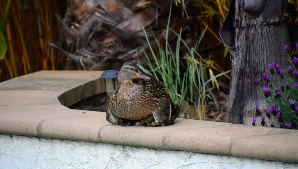 Fortunately, because it’s spring, we have quite a lot of breaking news happening out there. My daughter reports that we have another opossum, the backyard smells as if the skunk has finally moved away (or simply gotten used to us wandering about), the rabbit family has had another set of kits, and Mama Duck has hatched ten fluffy new ducklings in a nest under our palm tree. The ducks and the ducklings are getting the most attention, as Mama Duck is very busy right now teaching her ducklings how to swim and forage. Also, she tends to do this in the daytime, when we’re able to see her.