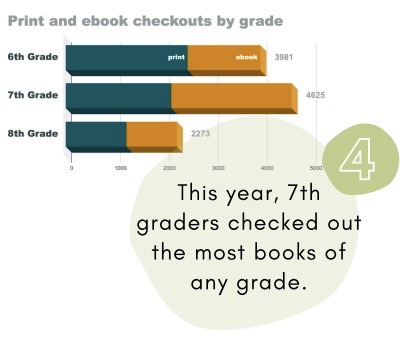 This year, we had a mixed result. Sixth graders checked out the most print materials, but when you include ebooks, the seventh graders checked out more books overall. Sadly, the 8th graders aren’t reading nearly as much as the other classes. Perhaps we could figure out why and do some targeted interventions for 8th graders next year.