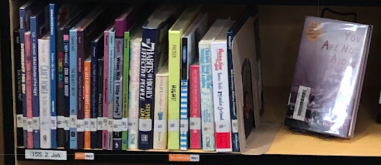 My first attempt at this involved labeling the sections of nonfiction that included books about topics that are often important to teenagers, but that they don’t always want to ask adults for help finding books about: mental illness, drug use, LGBTQ+ issues, puberty, divorce, grief, that sort of thing.