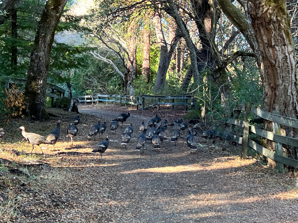 We went for a walk around the nature trail at Filoli Historic House and Gardens a week or so ago, and ran into an enormous-to-us gang of turkeys. Much of the rest of our walk was taken up by speculating on collective nouns for turkey swarms – are they a flock, a gaggle, a gobble, a posse, or a herd?