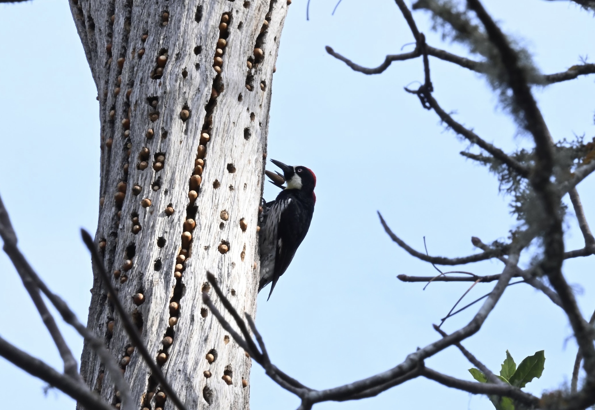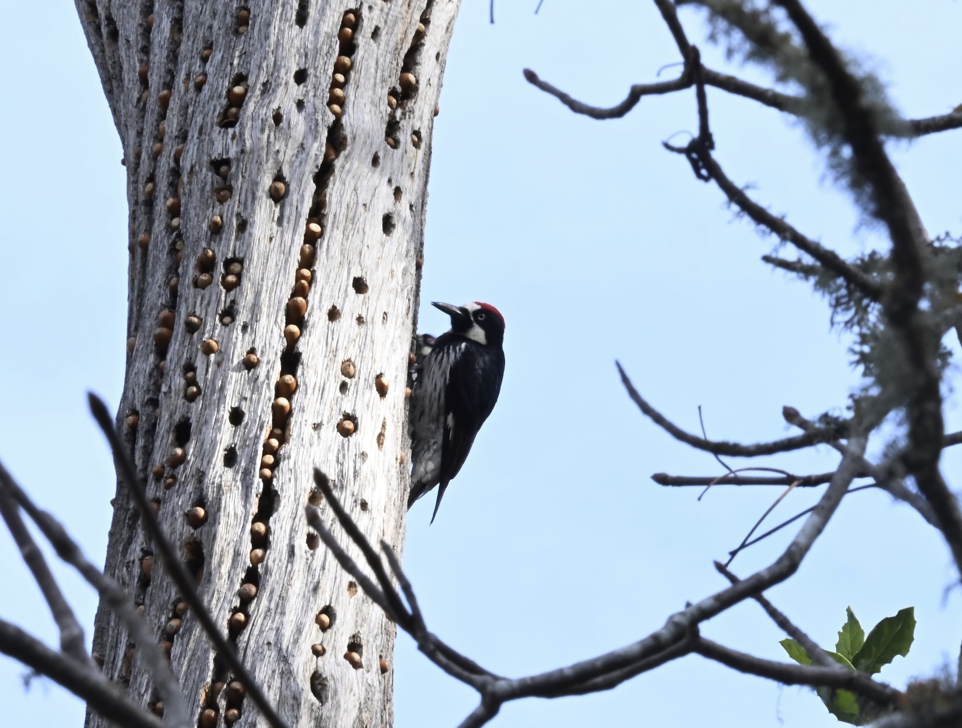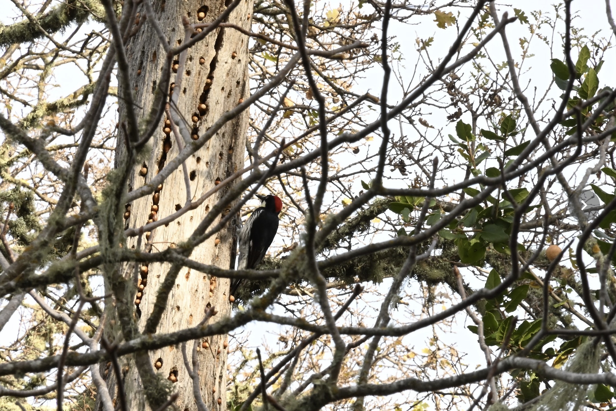 My husband took a lot of pictures of this fascinating and new to us behavior. Our minds were full of questions: Are they storing those nuts? Retrieving them? Did they kill that half of the tree by making all those holes or was that bit already dead before they started drilling?