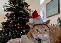 photo shows an orange tabby enraged at having to wear a santa hat.